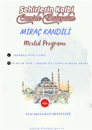 Merkez Site Camiinde yapılacak olan Miraç Kandili programına tüm vatandaşlarımız davetlidir.