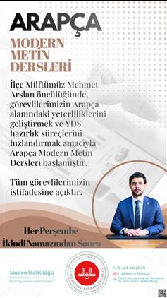 İlçe Müftümüzün öncülüğünde, görevlilerimizin Arapça alanındaki yeterliliklerini geliştirmek ve YDS hazırlık süreçlerini hızlandırmak amacıyla Arapça Modern Metin Dersleri başlamıştır.